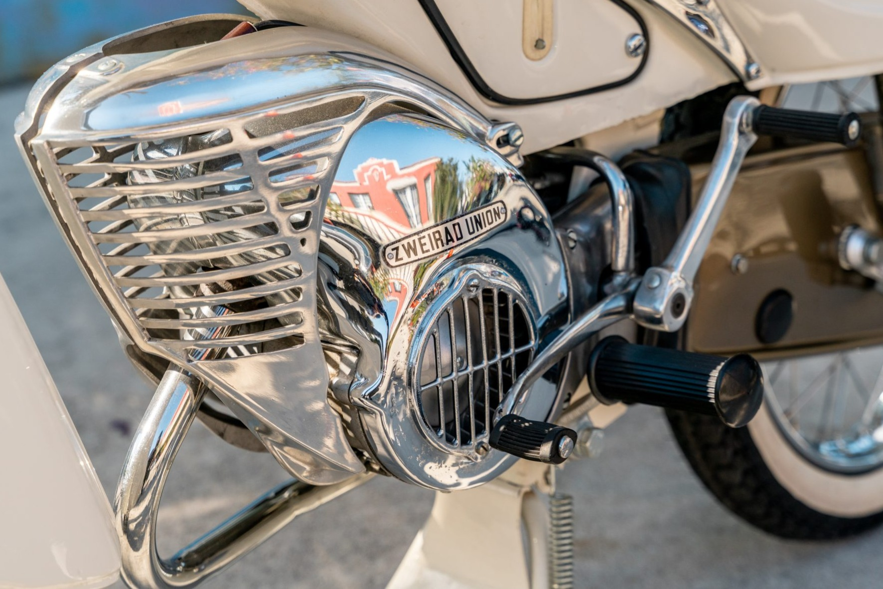 The little fan-cooled engine produces a wee 2 horsepower driving a three-speed transmission and drinking from a 12mm Bing carburetor. A moped engine could be left as-is, but no, Zweirad Union covered it with a chrome shroud.