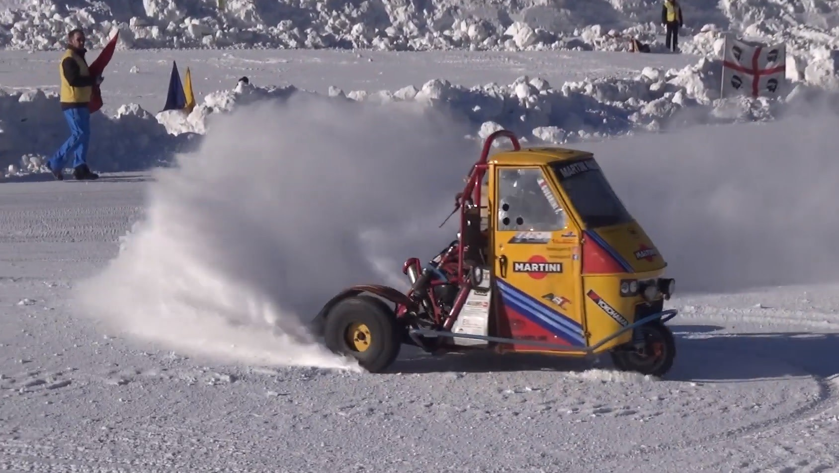 Oh yes. The proper way to do a good snowy donut is with a little three-wheeled Italian thing powered by a Triumph 675 Street Triple engine and a full boot of send it leaning on the throttle pedal. When you've got a zinger of a motor stuck on the back axle of what was originally a little trucklet built for European cities and speeds no higher than 30 kph you really need to give it the welly and make that motor sing.