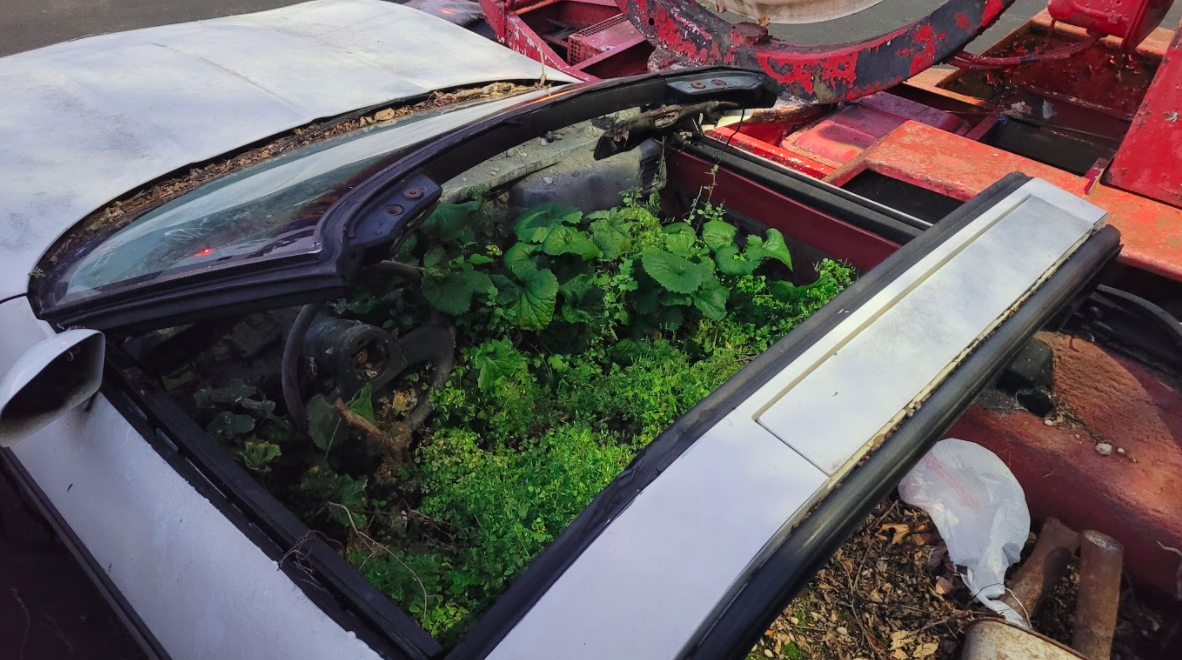 A reader just sent in a bunch of photos of a white C4 Corvette filled with plants, twigs, a plastic bag (?), a muffler (??), and concrete (???). I don't know what's going on, but I figured I'd share it with you, dear readers. Update: It appears to be a famous Corvette!
