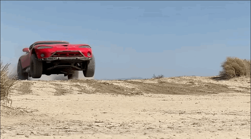 Fast forward to now, though, and the lifted Viper is ready for the test we've all been waiting for — the off-road shakedown. It's still a rear-wheel drive car, so donuts are a given. Without four-wheel drive, though, how does it handle rock crawling? Ehhh...it's not great, but it's better than you might have assumed. Without a crawling gear, it's just too easy to overwhelm the rear tires. If you're more interested in doing a couple of sweet jumps, though, the off-road Viper's got you covered. It also proved to be quicker than the Ford F-150 Raptor that they brought along.