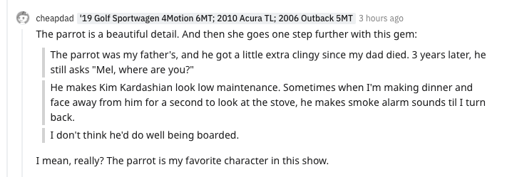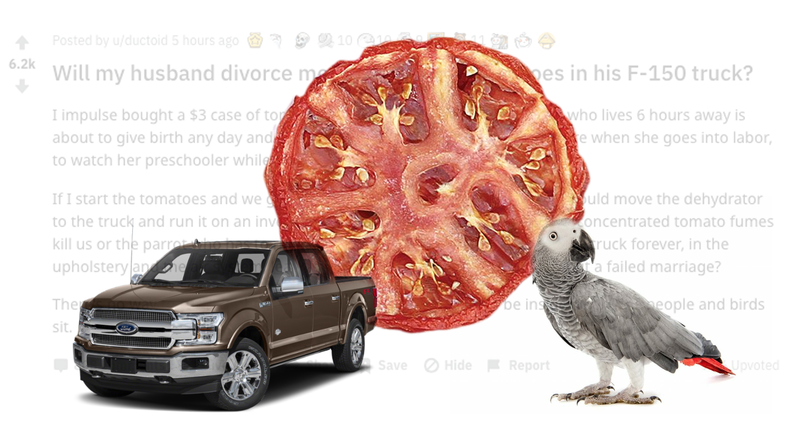 The internet is a pretty mixed blessing, overall. On one hand, we now have finger/toe-tip access to the vast majority of human knowledge, and on the other we now all know way, way too much about everyone, everywhere, always. And yet sometimes what we learn about people we don't know can prove to be so gloriously, bafflingly fascinating that it somehow is all worth it. Like this question that popped up on Reddit's r/cars forum, where a someone is worried about a divorce if they dehydrate tomatoes in their husband's car. With a parrot.