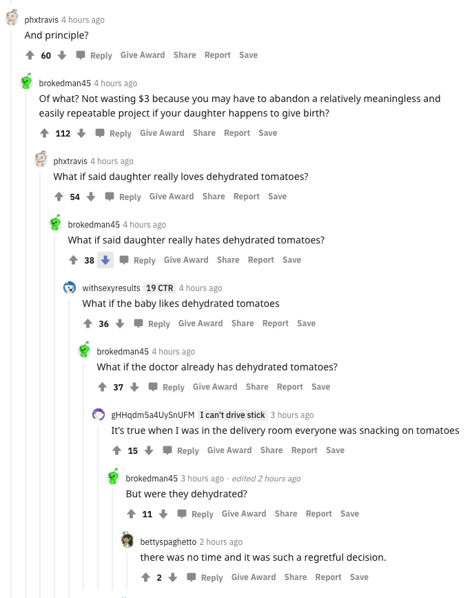 • Our humble OP, who goes by Ductoid, bought a three-dollar case of tomatoes on "impulse." She wants to dehydrate them. Let's keep in mind that the amount of capital at stake here is three one-dollar bills, or possibly a dozen quarters.