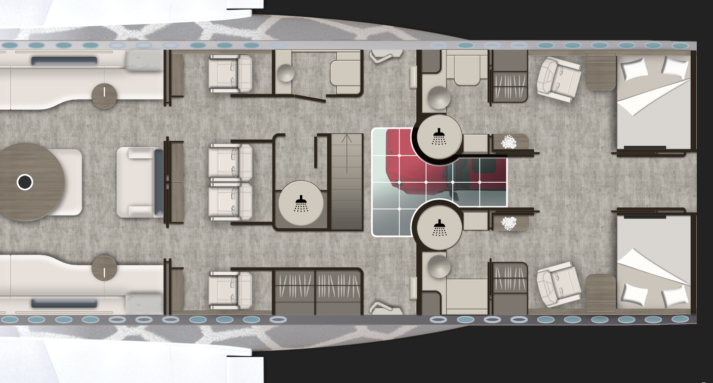 That connects to a lounge designed in part by German car tuner Brabus. The cars can be viewed on the main deck through a glass floor just behind a lounge with displays all over the ceiling that can simulate environments from an aquarium to a disco.