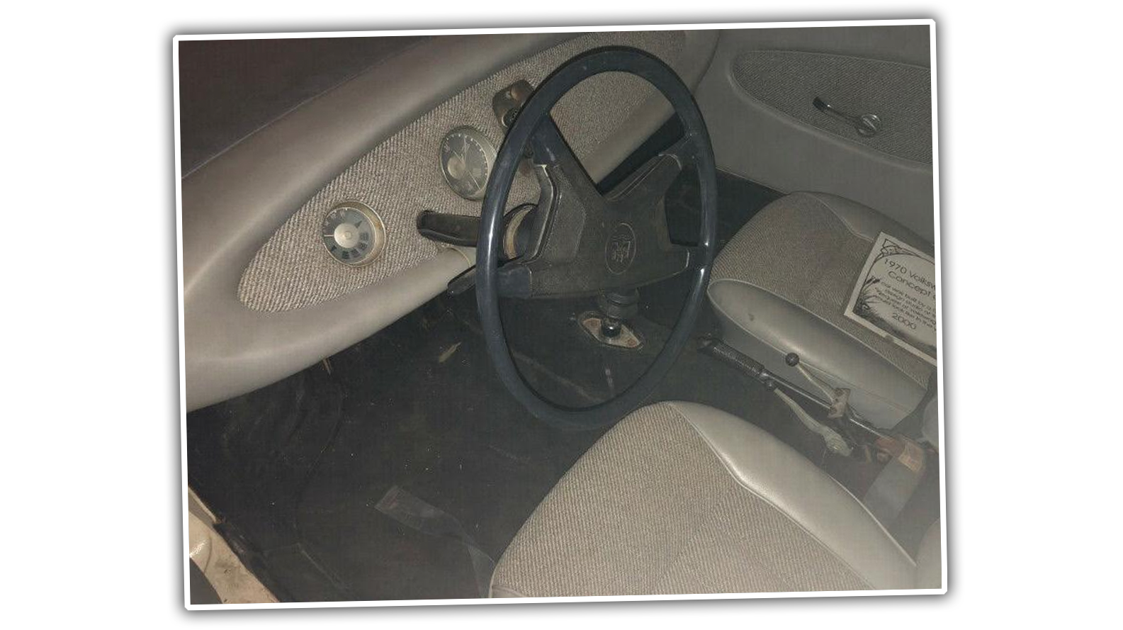 Pictures of the interior show gauges from a VW Type III and a steering wheel from a 1972 and up Beetle, which if the car is from 1970, must be a later replacement. I do think the donor car is from around 1968 to 1970, as the steering column and heater controls that are visible here are from that era.