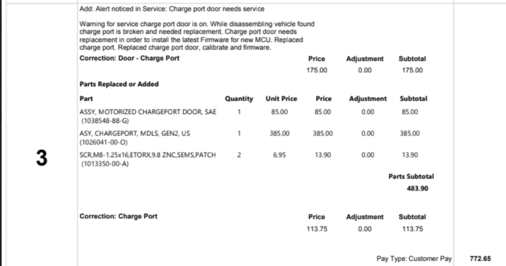 Charge port doors have also been an issue, per the ~288,000 mile service called "Adjusted charge port door to sit flush with the body" and the "Charge port Door replacement" at ~374,000 miles. This latter service actually included replacing the charge port itself (which, per the invoice above, was broken) in addition to replacing the door, a job that, according to the invoice, was necessary to install firmware for the new MCU.