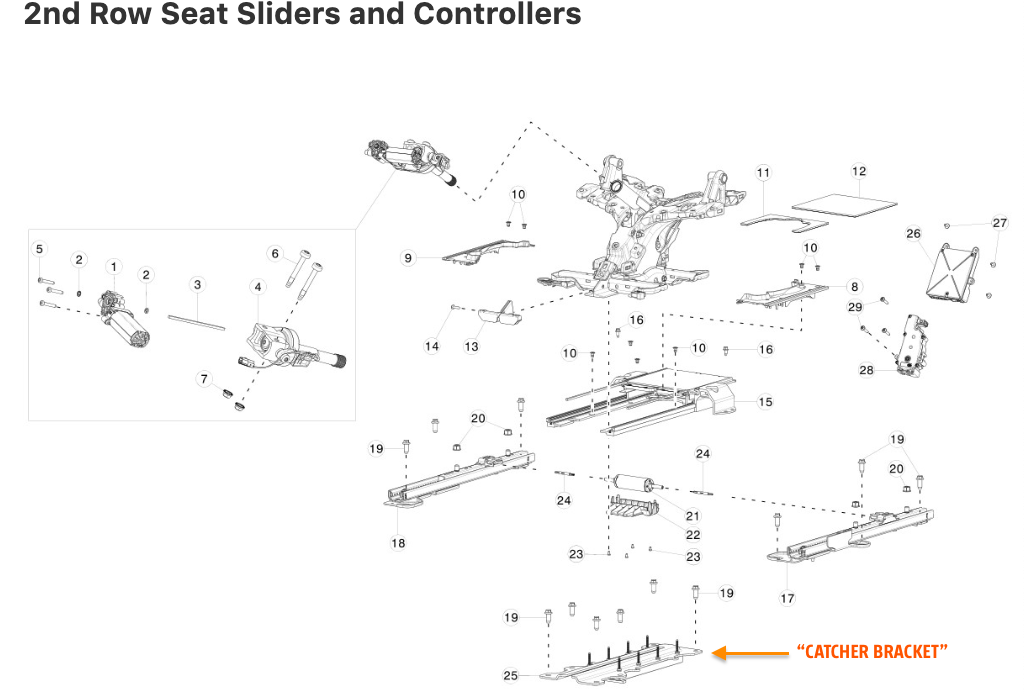 There's a $232 line item in Tesloop's spreadsheet labeled "Replaced 2nd row left & right side catcher bracket." That, according to the diagram above that I found on Russian Tesla parts website Electromobili, appears to be some sort of flat bracket that I assume mounts to the floor. The service record states that the fix was meant to addressed the concern: "2nd row seat are noisy when adjusting."