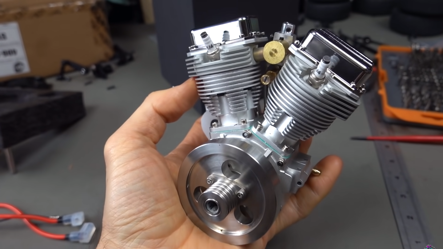Things are pretty neat on the performance side. It's fed from an appropriately tiny carburetor, each cylinder gets two valves and the 9cc V-twin can rev up to 8,000 rpm. That's more than my Buell! It results in an output of 0.8 horsepower and it even runs on gasoline.