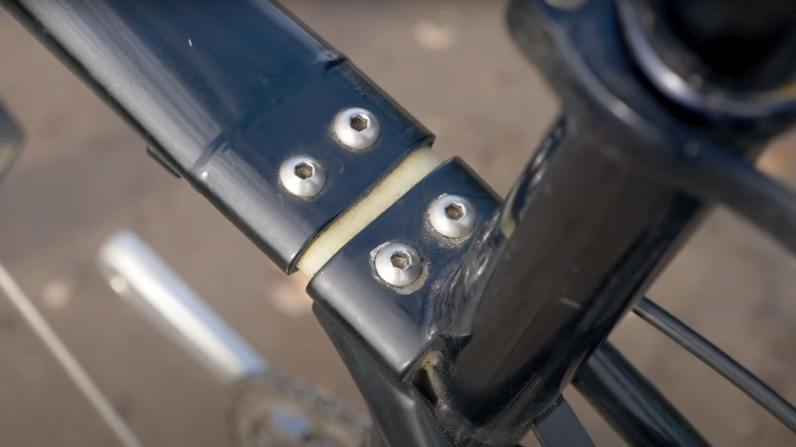 Designed in the early 1990s, it features a joint in the steel frame's top bar that was plugged with a piece of fiberglass. Rumors suggest this piece was taken from the leaf springs in an old Corvette, but wherever it came from, the piece gives the top bar some flex to absorb bumps.