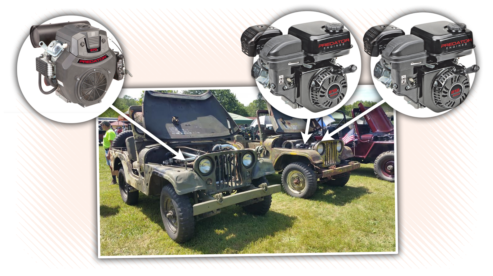 Posted to Facebook by Brett Wagner, the pictures show a yellow and olive-drab Jeep, each of which is now powered by Harbor Freight horizontal-shaft multipurpose engines listed for applications such as mowers, water pumps, and pressure washers. (It's worth noting that many typical store-bought lawnmowers use vertical shaft motors, though a few do use horizontal shaft engines like these).