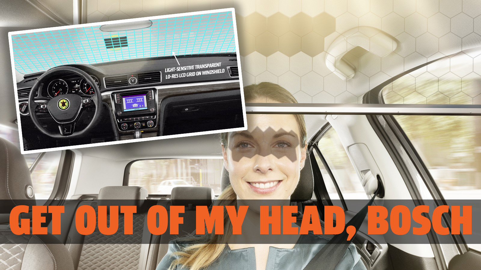 Okay, I guess I should be clear right up front that, no, I can't technically prove that Bosch engineers read my article from about a year ago, saw my dynamic, LCD-based sun visor idea, and decided that, hey, let's take this high-quality idea as our own and develop a prototype and show it at CES! I mean, yes, it's effectively the same idea, but I guess it's possible their engineers came up with it independently. Or, more likely, they're monitoring my brainwaves via the ignition coil in my car. Either way, this new visor tech is actually a very good idea.