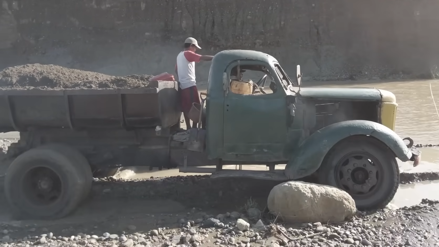 Watch a rusty ZIL dump truck go off-roading and water fording to do its job, transporting tons of sand.