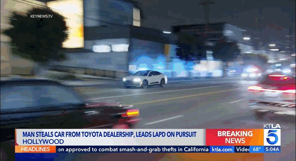 The theft happened around 11:20 p.m. on September 14 at Toyota of Hollywood. LAPD officers responded to reports of a break in and found the suspect still inside the dealership. Officers ordered him to come out, but instead he managed to get into the dealer's lockbox and grabbed the keys to a white Toyota Crown. What happened next is probably the most excitement any Crown will ever see.