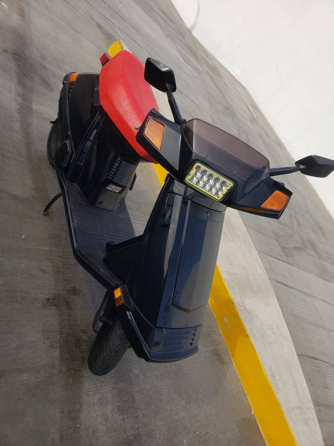 This Honda CH80 Elite scooter was recolored under current ownership. It's probably black, but the white balance in the listing photos makes it look kind of purple and I'm just gonna run with the Eva thing. The red seat is for Asuka.