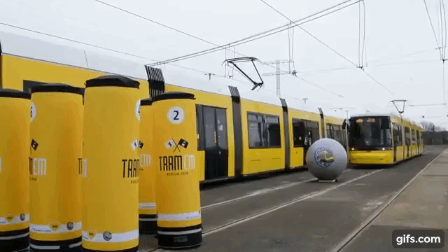 The competition involves a series of four trams and four different challenges. The first tram has the objective of stopping without hitting a cone. The second challenge is to get as close to a placed statue without hitting it around a curve. The third challenge is an effort to stop the tram doors at the exact right point on a platform. Then a fourth to operate a panic stop within a certain stop box. But then comes the best of the bunch to end it where two judges hold a giant inflatable ball and the tram is accelerated toward the ball as quickly as possible to hit it into a group of weighted and inflated pylons. And the whole thing is timed. It's amazing.