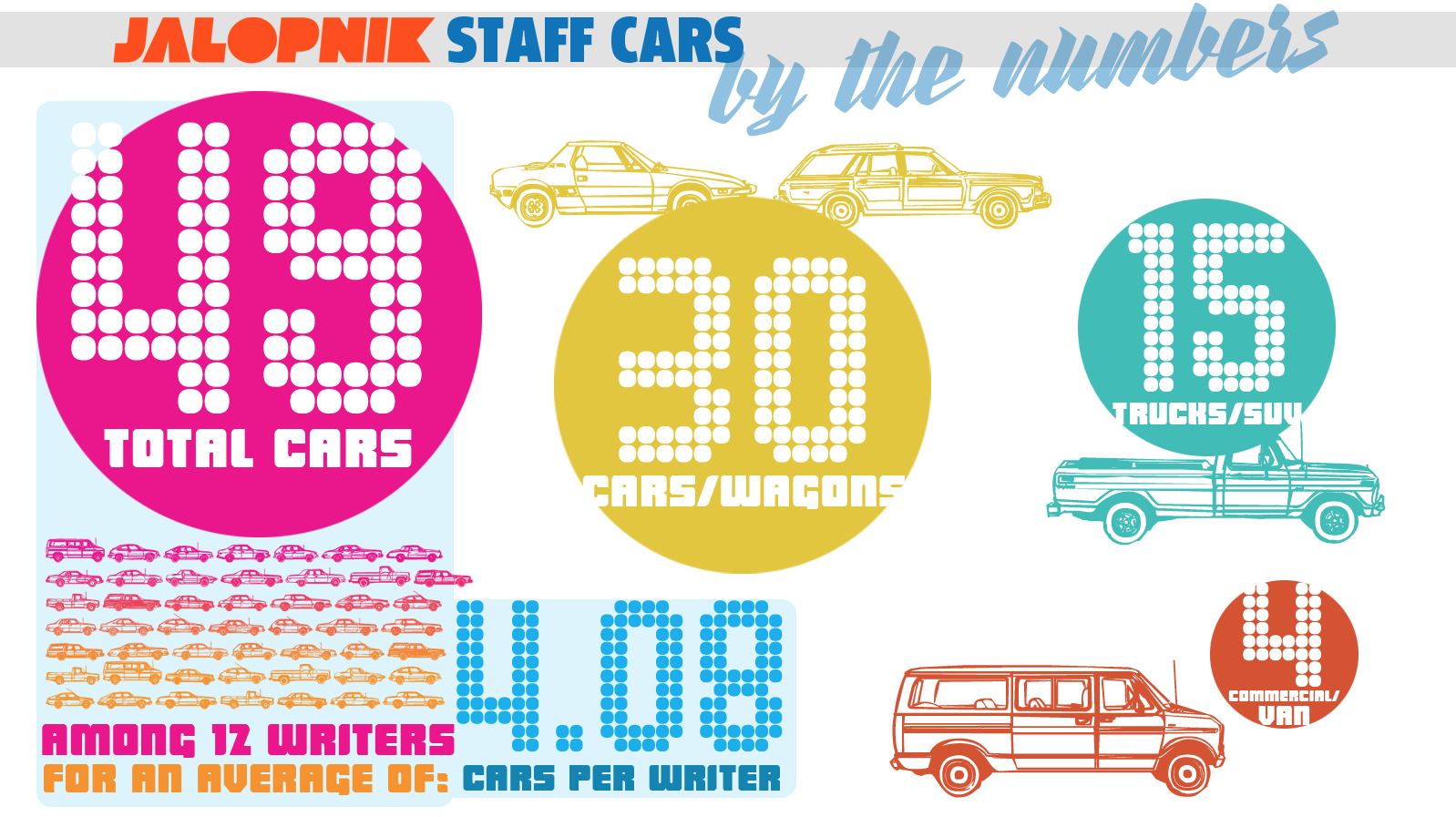 I'm only writing this to keep track of what my colleagues own, because things have gotten severely out of hand. I mean, 49 cars between 12 writers!? Who are these weirdos I work with?