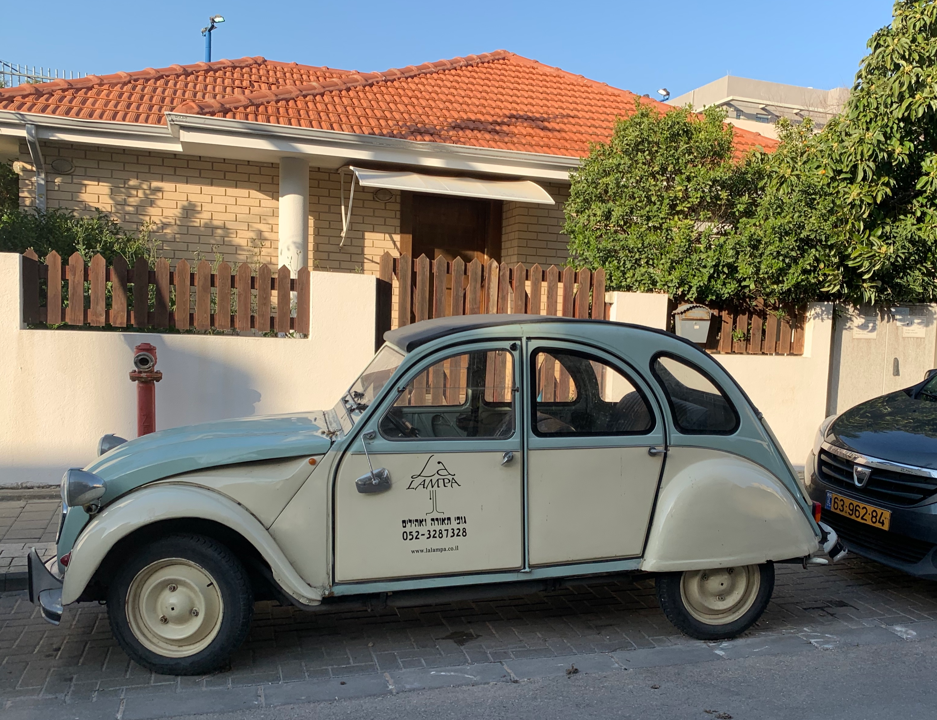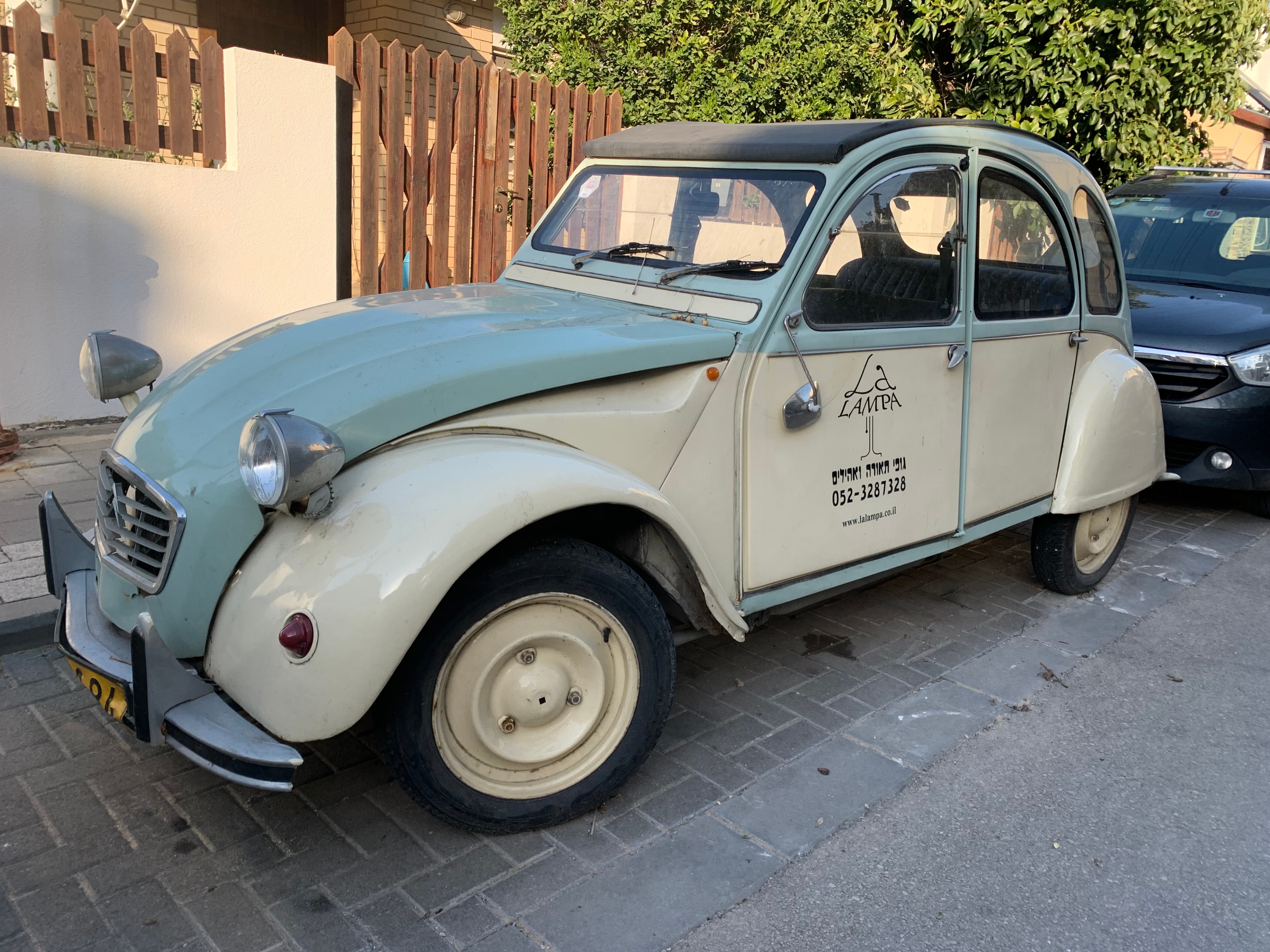 The 2CV, which I found in Tel Aviv's first neighborhood, Neve Tzedek, is done up, like many iconic Citroëns these days, as a piece of mobile advertisement. In this case, for an event space for weddings and bar mitzvahs in the like. It's a time-tested formula perfected by HY van owners the world 'round. My hope is that it'll keep working for this Citroën owner once we all get back on the street and sharing events with one another when this period is behind us.