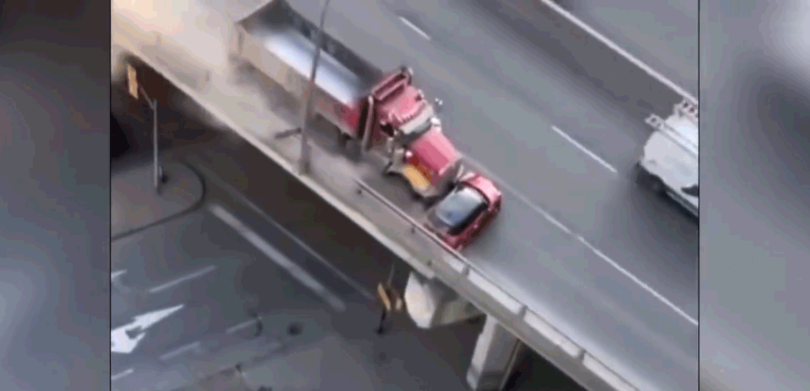 Unaware Dump Truck Driver Hits Mini, Pushes It Half A Mile Down Toronto Highway
