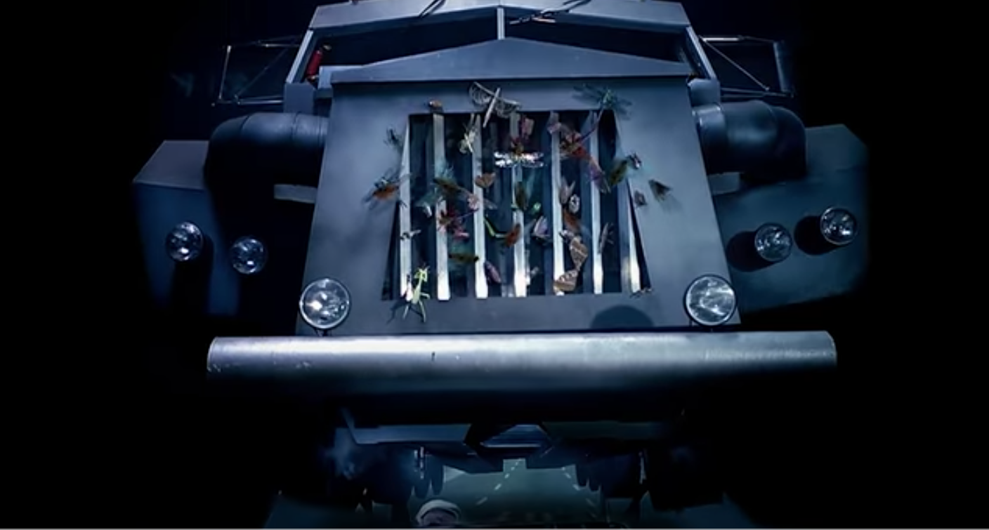 Soon we pan up, revealing the imposing pediment of the truck's grille, slathered in massive twitching insects, and sporting a rakish six-headlamp setup: