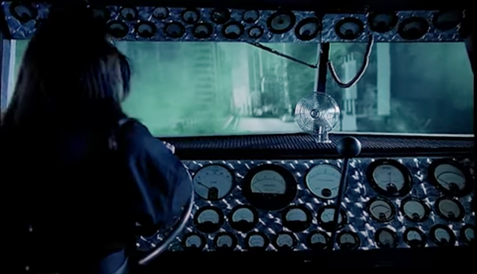Unlike many fictional vehicles used in music videos, we actually get to see under the hood of this brute, as Björk has to do a bit of maintenance on it, rising up to the level of the hood via some manner of extendo-tube that could be part of the truck or part of her pants or boots; it's not terribly clear.