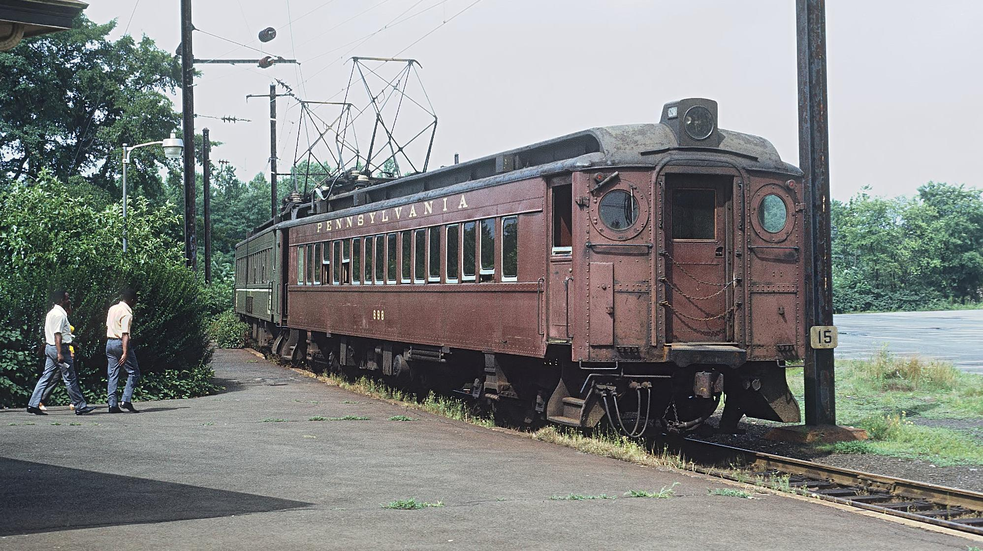 On that day, the train — powered by a Pennsylvania Railroad MP54 electric railcar — was running full of commuter passengers and college women traveling to campus to meet their dates. Before it could reach its one and only stop, the engineer in control spotted an empty convertible parked on the tracks. They stopped the train, only to see a horse appear from the woods at full gallop. Its rider was dressed up like a cowboy and held a revolver. Three more men dressed as cowboys emerged on their own horses to join the first man.