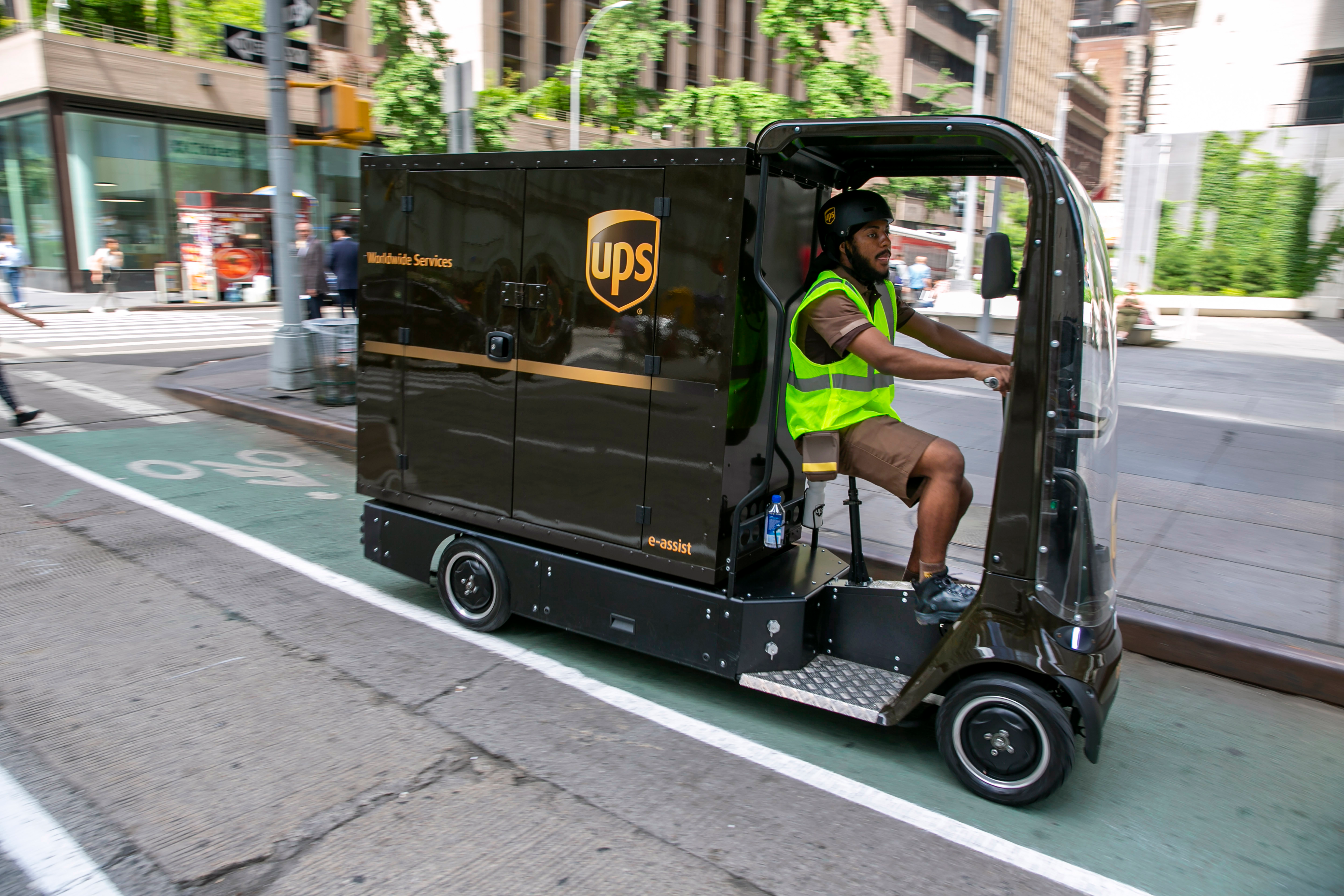 The UPS eQuad fits in a bike lane and has battery-assisted pedal power.