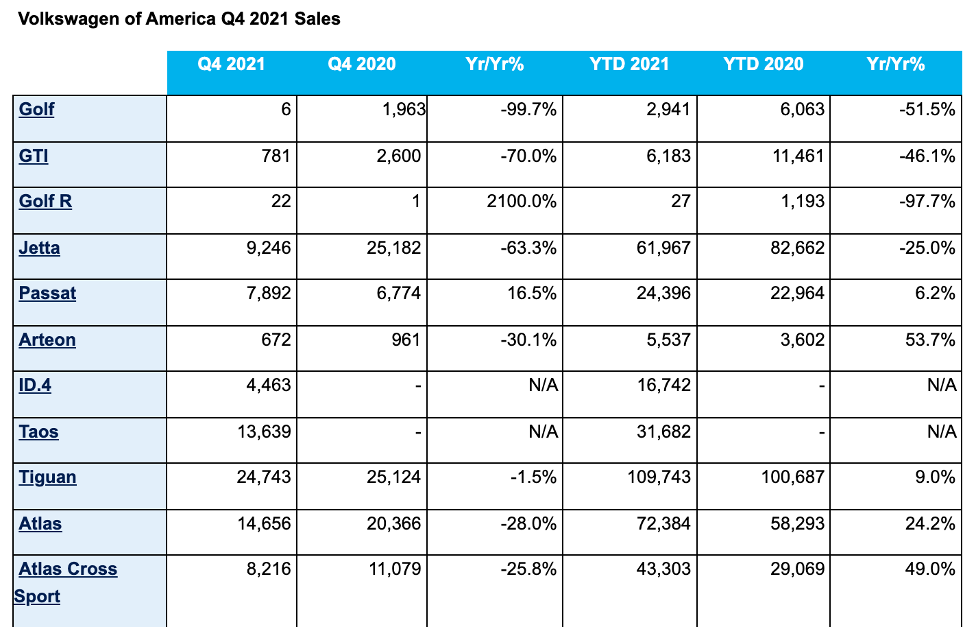 Well, best since 2013 to be precise. Over three-quarters of fourth-quarter sales were VW SUVs, including the Taos, but also the Atlas, Tiguan and Atlas Cross Sport. Delightfully, sales for the Arteon, which is an outstanding car, were up 53 percent year-over-year, the biggest jump of any VW. Sales of the Golf, Jetta, GTI, and Golf R, on the other hand, all nosedived. (Update, 5:01 p.m.: VW emailed to note that GTI and Golf R sales were down because the company "barely had any to sell, since GTI was a run out model and R production ceased after the 2019 MY. But we do have Mark 8s getting into the showrooms, as you can see from December's sales numbers." Also: VW Group of America CEO Scott Keogh said that crossover production was prioritized this past year over Jetta production because of the chip shortage, which helps explain Jetta's numbers. My apologies for not including this context before. As you were.)