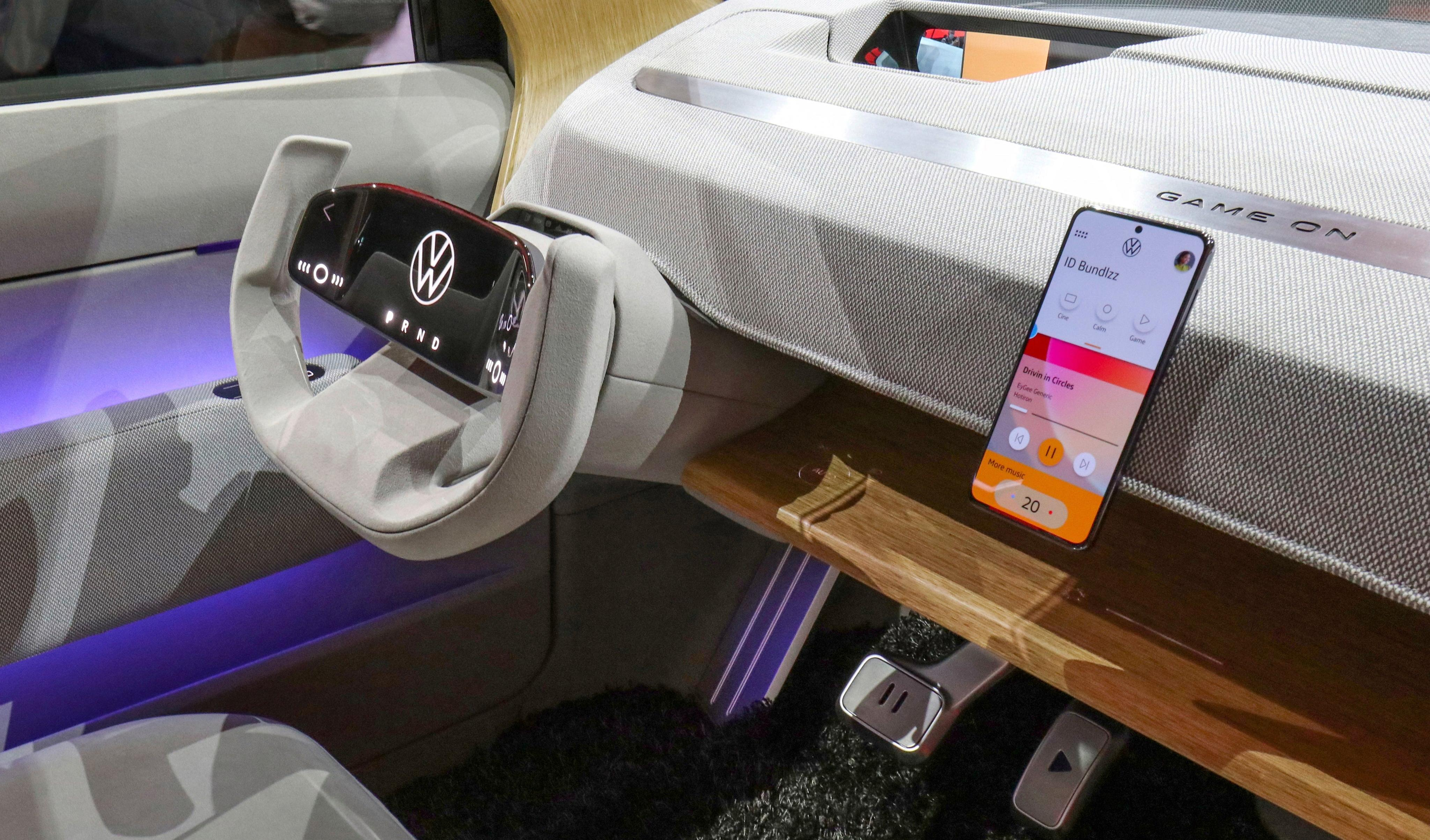 Or not, as this interior is kind of garbage — especially the dumb steering yoke, dear God VW what are you thinking? Or is that further Tesla imitation? — but the pedals are cool, particularly the play and pause symbols on them, which I assume have some kind of gaming function.