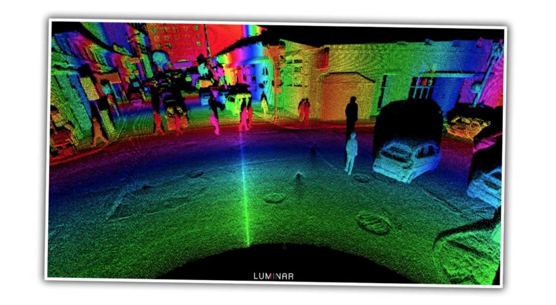 In practice, lidar can produce some very detailed, high-resolution visualizations of the environment around a self-driving car. You can see what this looks like above there.