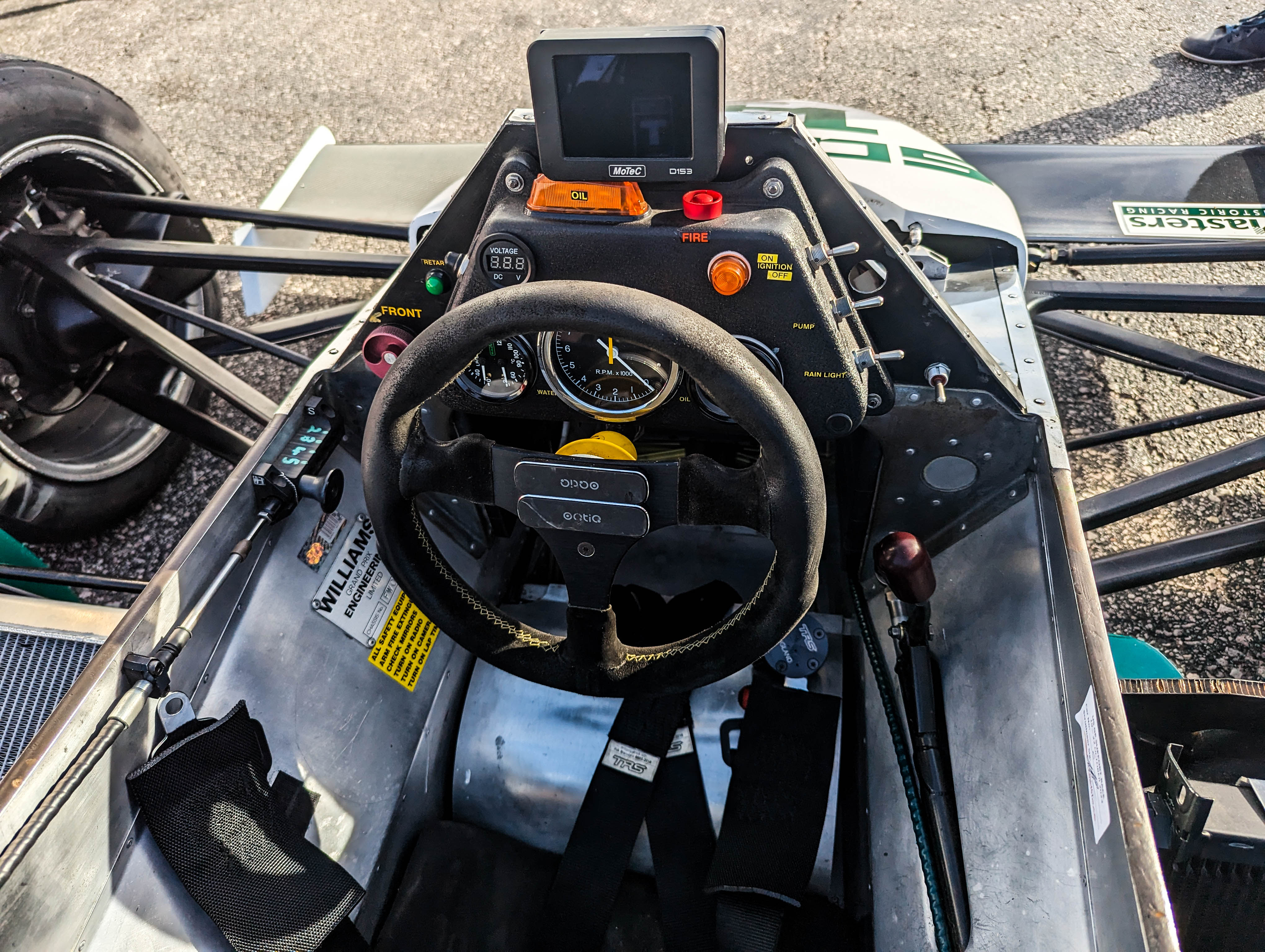 The cockpit of the Williams FW08; it's narrow, with just a few controls to consider.