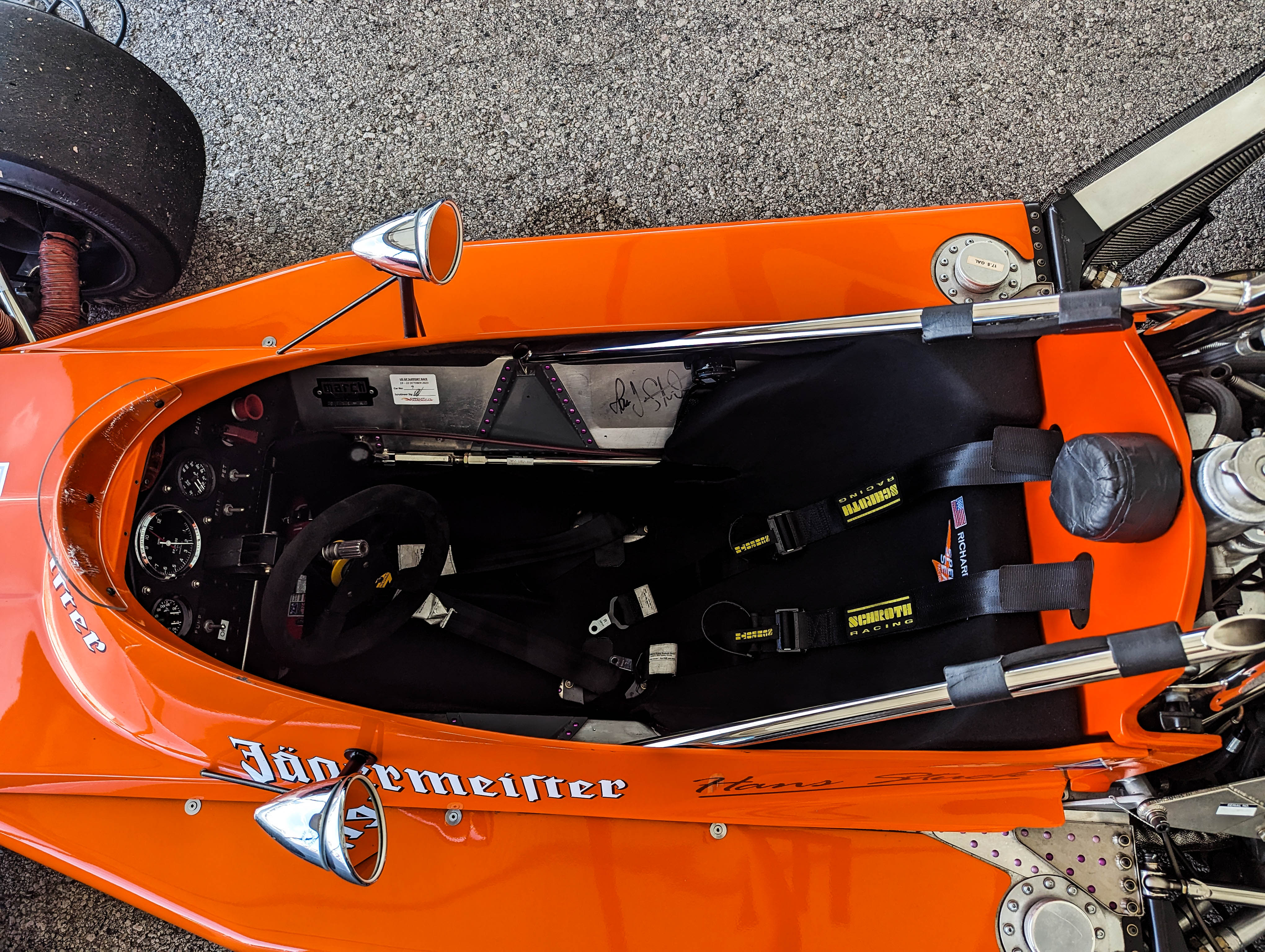 The March 741 was designed and built by March for the 1975 F1 season. You can see the signature of one of its drivers, Hans-Joachim Stuck, in the cockpit.