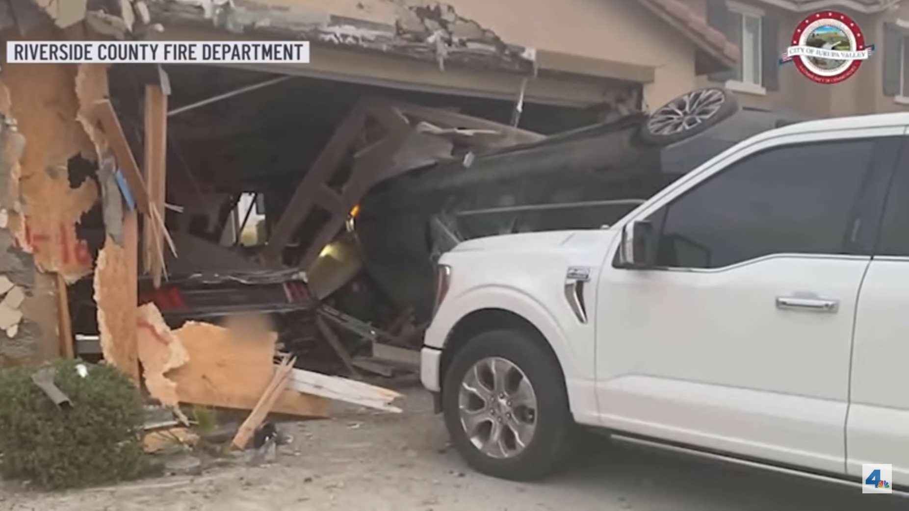 The driver in Jurupa Valley, which is about 51 miles east of Los Angeles, mounted a manicured lawn before leaping through the air, reports USA Today. The car then hopped over one parked truck, before crashing through a garage door and hitting another truck parked on the driveway. As it smashed through the garage, the car came perilously close to a Ford Mustang parked inside.
