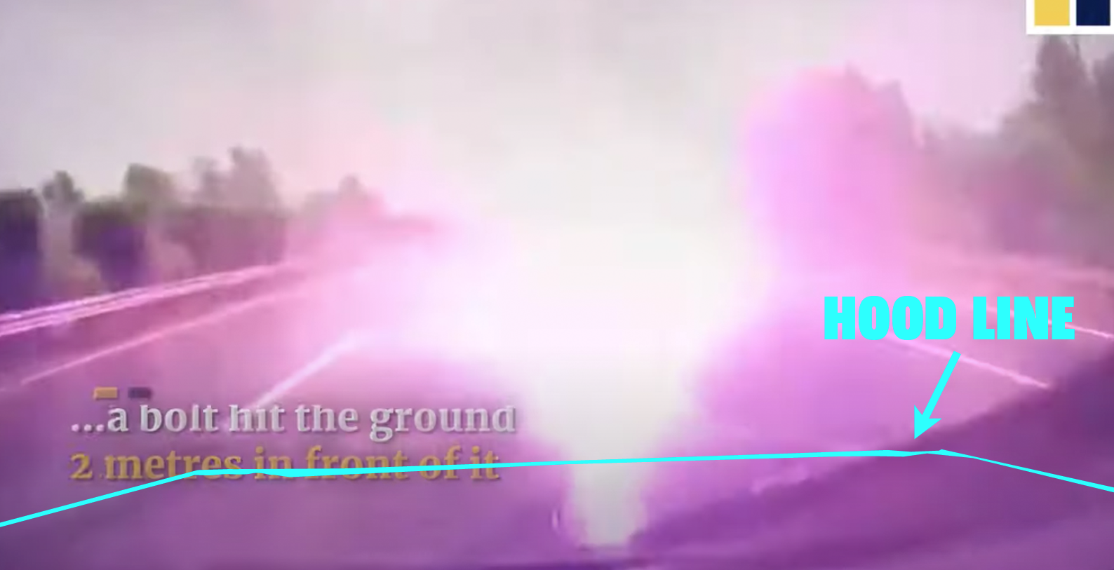 Strangely, this video of the event from the South China Morning Post—one that I can, importantly, embed here—suggests it shows a car "nearly struck by lightning" which is odd, considering the driver claimed the car was hit, and it sure looks like the bolt impacted the hood: