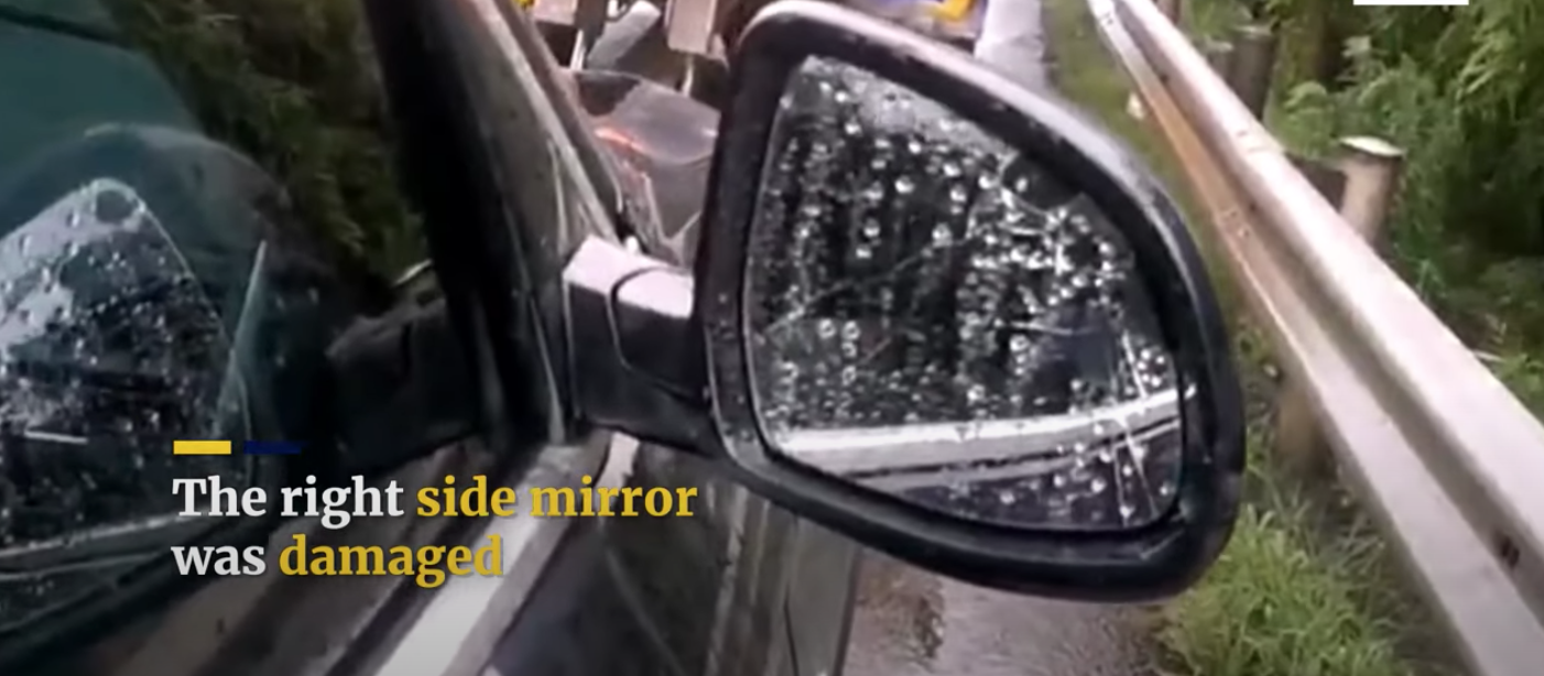 The video also mentions that the right-side mirror was damaged, which wouldn't seem likely unless the car was directly hit?