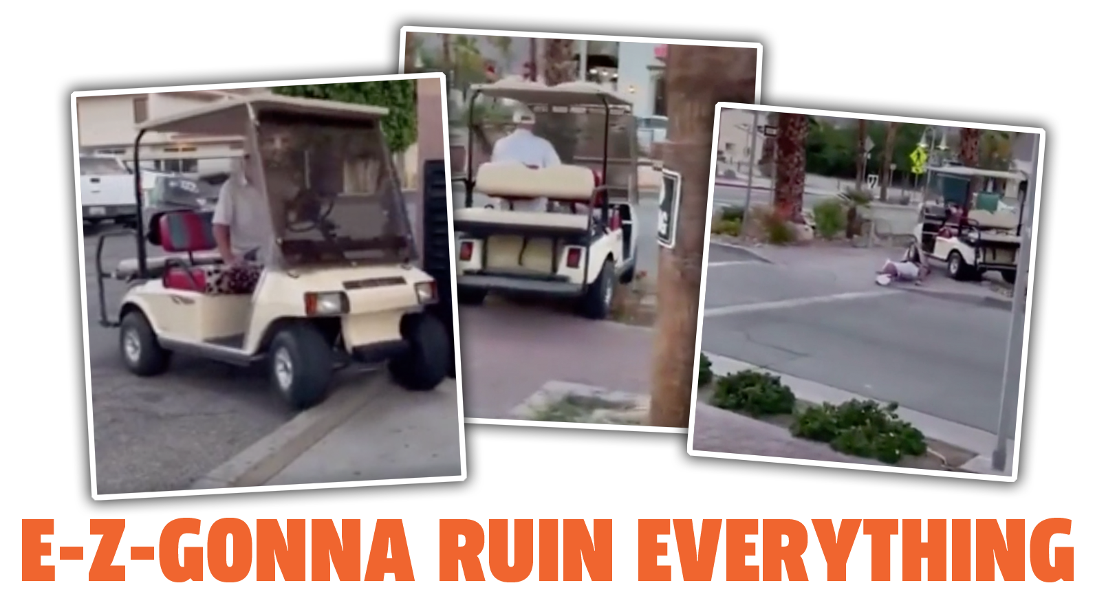 I know golf carts aren't really cars, but, at the same time, they're kind of cars. Smaller, slower, less of everything (and overpriced), but they're still motorized vehicles, and as such, it's probably not a good idea to try and drive one while drunk. Someone maybe should have told that to Grandpa Trouble over here, who takes a golf cart on a slow, inebriated rampage before face-planting right out of the cart.