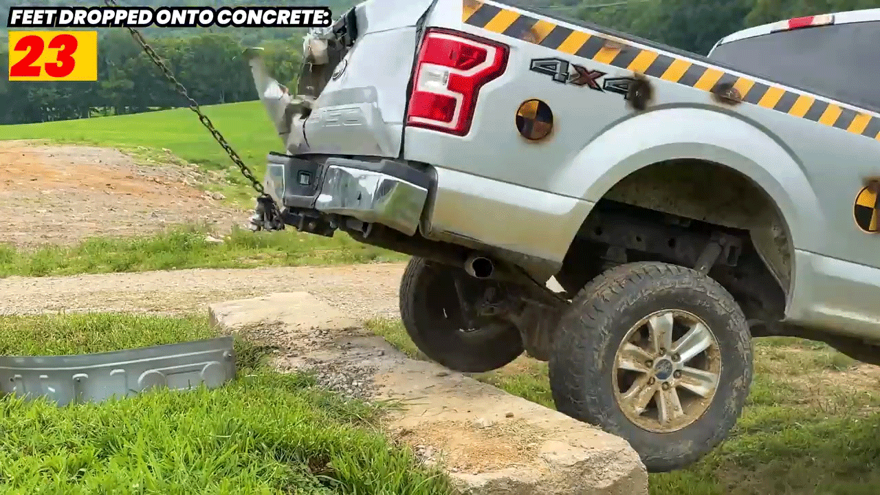 The F-150, unsurprisingly, held up to the same abuse as the Cybertruck. It held up to even worse, to being dropped onto concrete from multiple stories up without the hitch cracking off, until WhistlinDiesel finally bent the frame out of whack. Then, of course, he just dropped more concrete on the truck and bent it right back into shape.