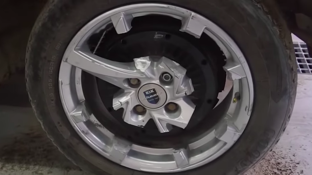 This comes from the world's number one source for absurd automobile-related experiments, the YouTube channel Garage 54, whose Russian host, Vlad, had three different aluminum wheels sitting around his shop. Seeing no reason to keep them, he decided to use a marker and an angle grinder to slice off a bunch of spokes to see how the wheels would fare with with a little bit of structural support missing.