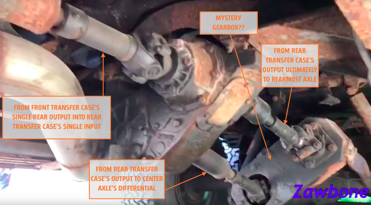 But such gearboxes are there so that only a single input shaft from the main transfer case can be used to power both the rear axles. In other words, such a gearbox bolted to the middle axle eliminates the need for a second transfer case. Gonzo Dave describes why he used such a gearbox, saying otherwise he'd have had to use a differential with its own rear output: