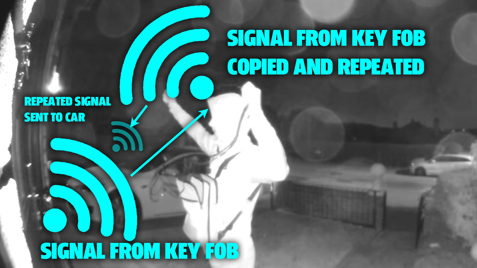 The video was shot from the Ring doorbell camera of a home in Borehamwood, a town near London. You can see one of the thieves raising his arms, not in a metaphorical attempt to raise the roof, joyfully, but rather to get a length of wire in a position where it can function as an antenna for the key fob relay unit that is, presumably, in that pouch on his chest.