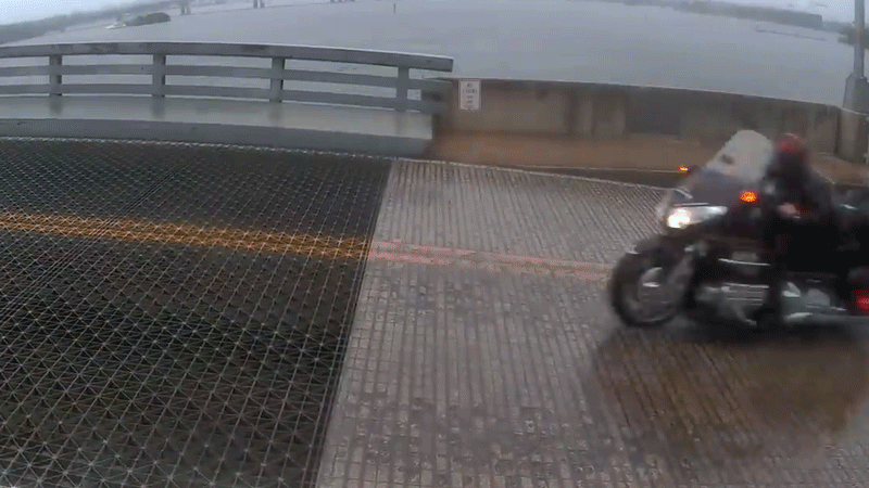 A report from Newsweek says that while the Dayton Beach bridge was being raised to let a boat through, a motorcycle rider didn't see the warning signs due to rain and ran right through a flashing red stop arm. Ow.