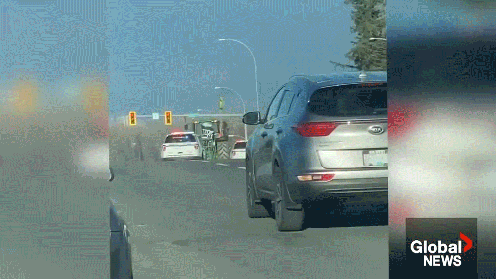 We still have a lot of questions about what actually happened to make Canadian police decide to execute such a dangerous PIT maneuver but video posted to social media, and obtained by Global News, depicts the cruisers chasing the farm tractor down Pacific Highway in Surrey, B.C. Just after noon on Saturday, the tractor allegedly broke free from a convoy of protestors and drew the attention of Surrey RCMP. This convoy of dipshits took to the streets of B.C. to protest the the teaching of sexual orientation and gender identity topics in province schools. The tractor was waving a flag in its back window reading "STOP SOGI 123" in which 'SOGI' likely stands for 'sexual orientation and gender identity'.