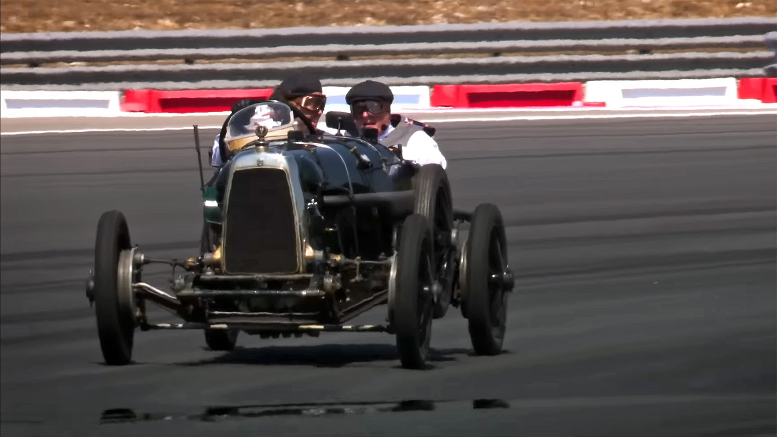 The four-time Formula 1 World Champion looks right at home driving the ill-fated 1922 "Green Pea."