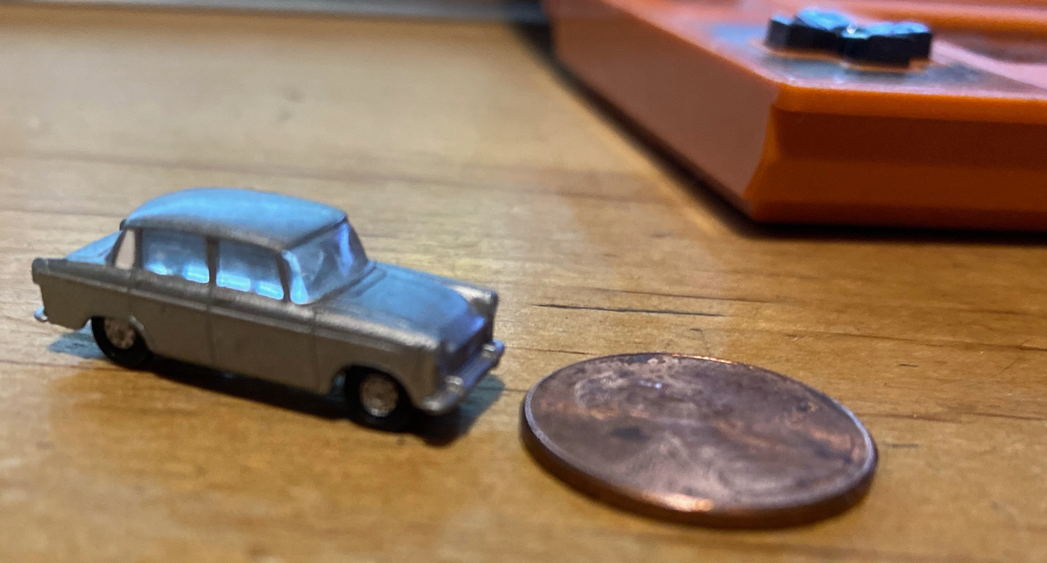 In case all the fingers and gigantic-looking tweezers and X-acto blades don't give enough scale, I happen to have a little Toyopet 1:150 scale car that lives on my keyboard, so I could very clearly feel the minuscule scale of it all: