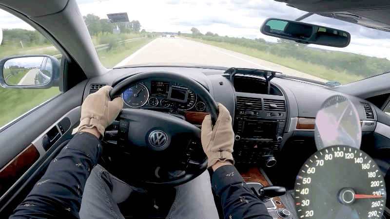 I haven't found the upper end of my Touareg V10 TDI's speedometer yet, but TopSpeedGermany on YouTube has. The YouTuber strapped on some gloves (?) then hopped behind the wheel of a 2004 Touareg V10 TDI to hit some ridiculous speeds.