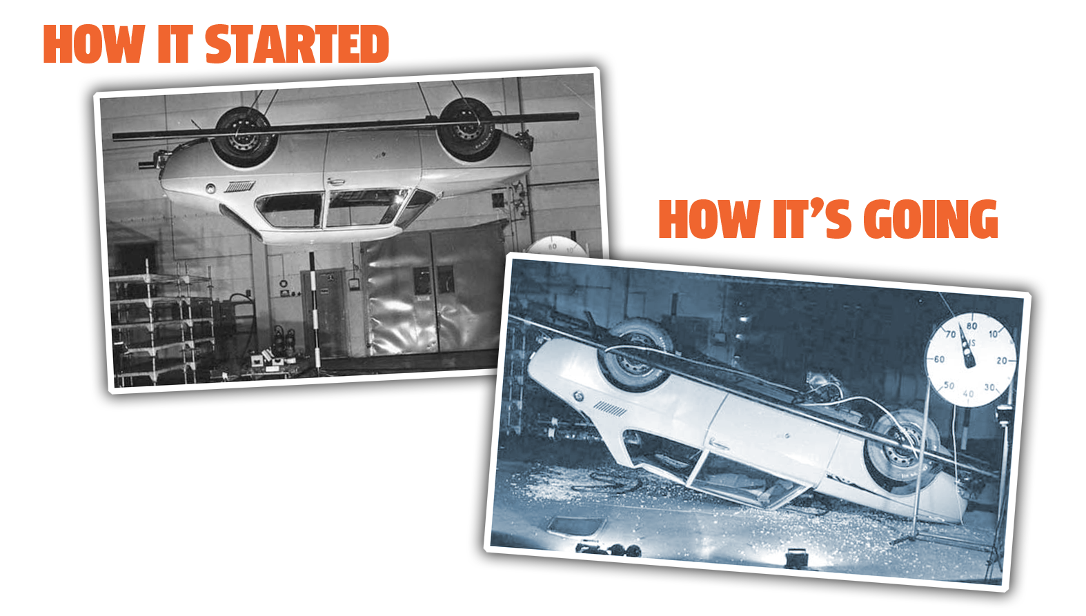 It's worth mentioning that dropping cars from cranes isn't exactly new; Volvo's Viking brother Saab used to do it, too, though from much smaller distances, indoors, and to primarily test rollover protection:
