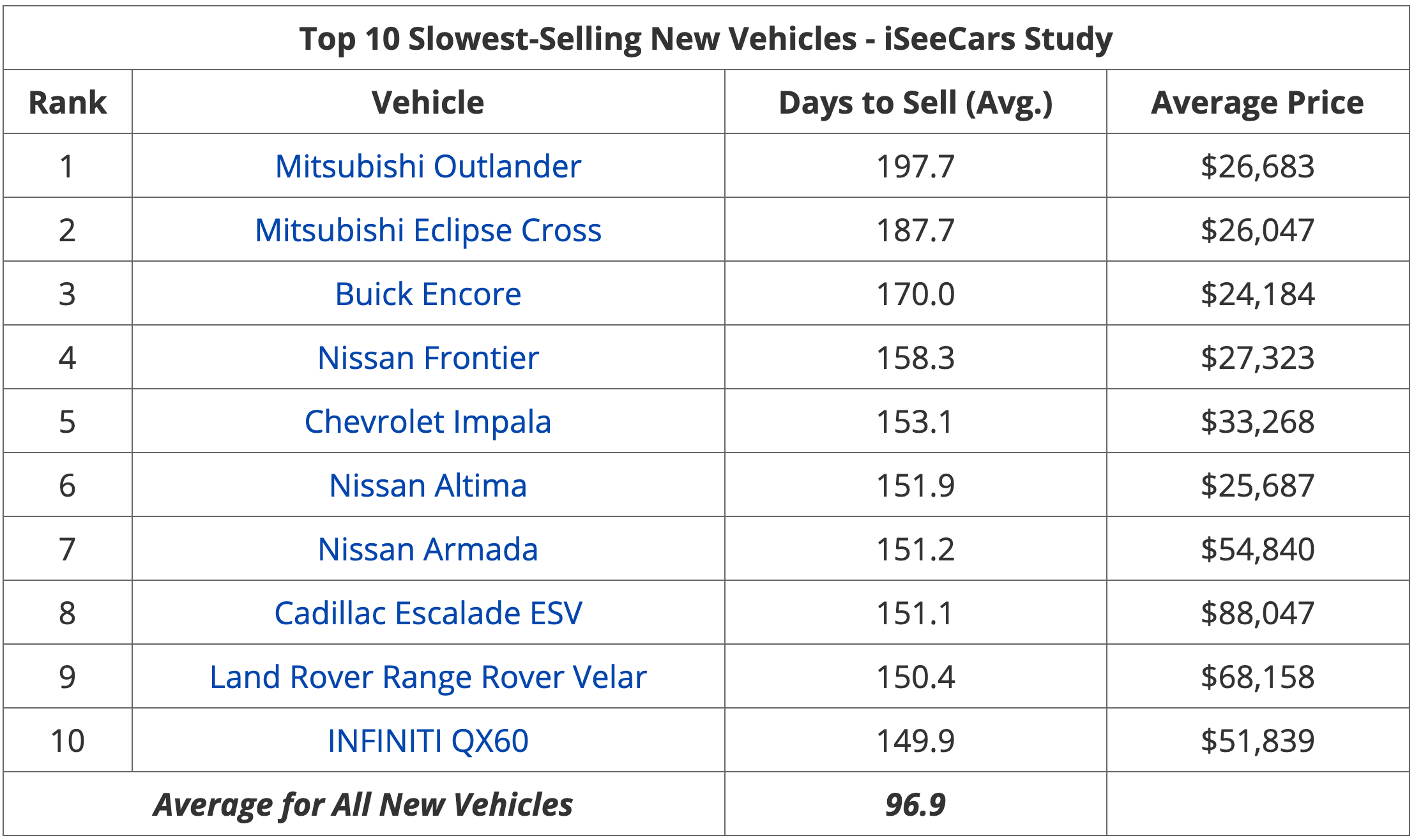 iSeeCars also analyzed the new cars that remain on dealer lots the longest. The top 10 slowest-selling new cars remain on dealer lots for at least 1.5 to 2 times longer than the average vehicle. "These slowest-selling vehicles present savings opportunities for consumers as dealers will want to move these vehicles," said Ly.
