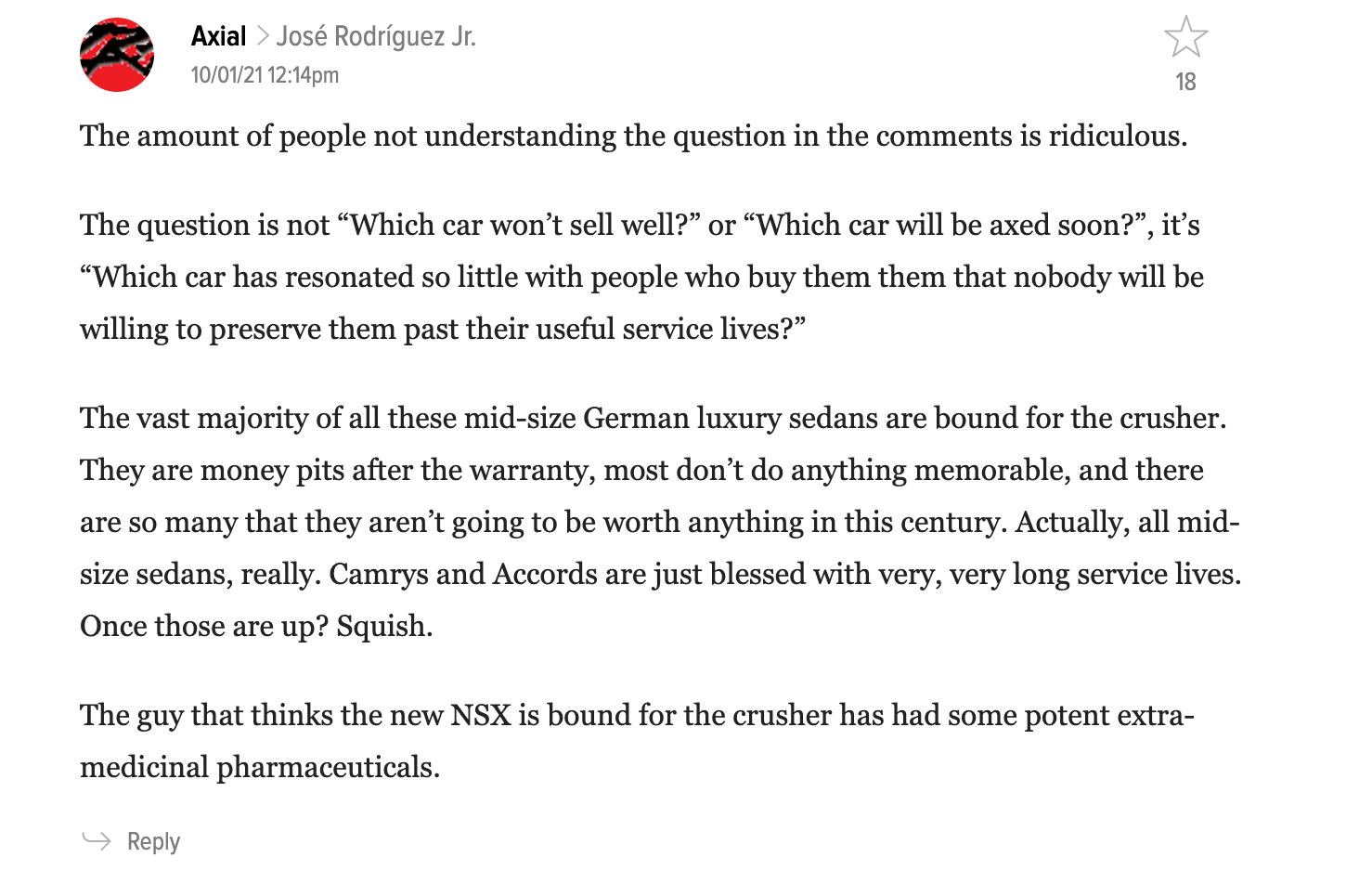The idea here is to name cars that that not a lot of people are going to keep, like that that '08 Avenger or one of the more boring "German luxury sedans." Shoutout to Axial for being one of the few who understood the assignment.
