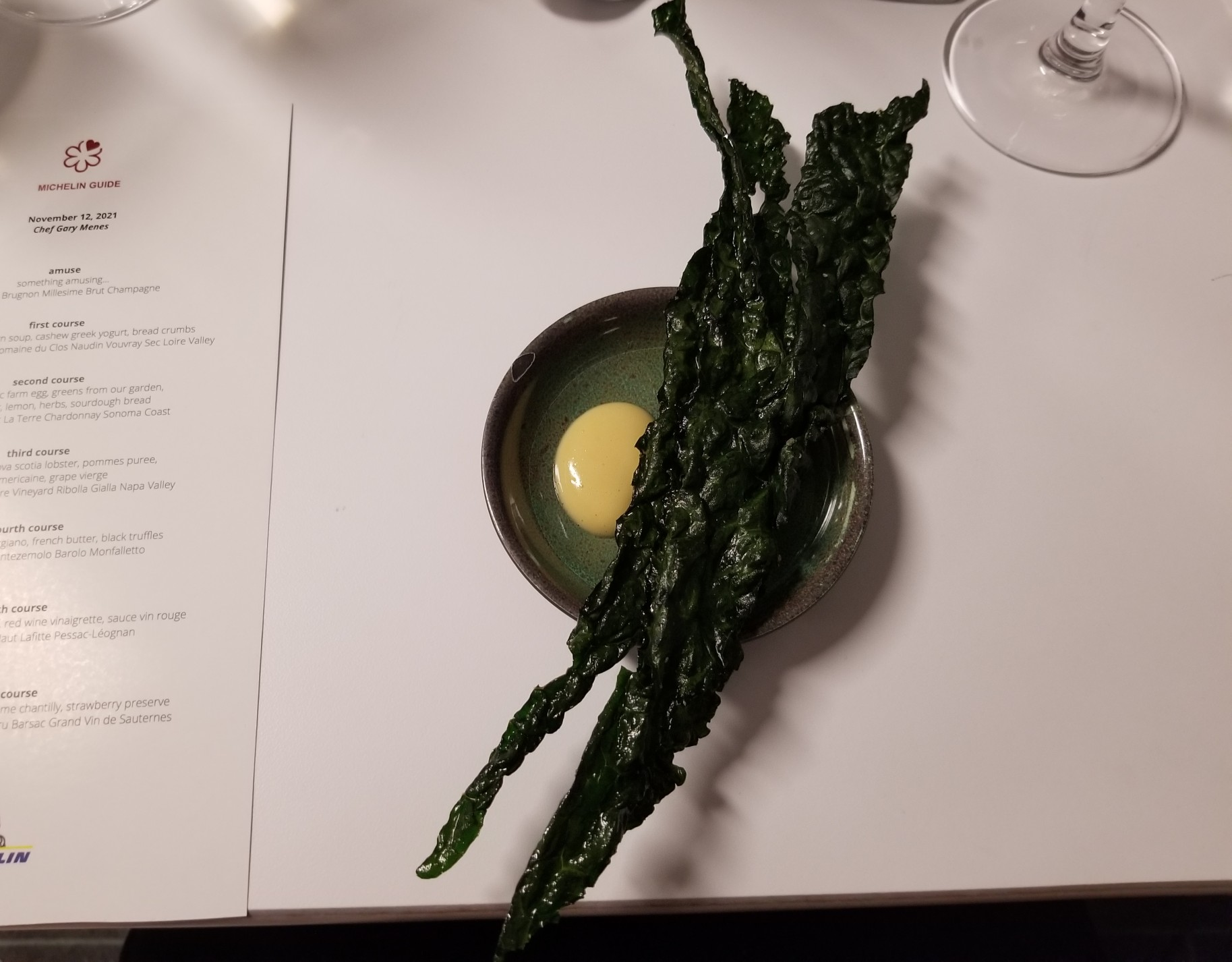 Something amusing (which turned out to be roasted kale chips with aioli). Paired with a 2019 M. Brugnon Millesime Brut Champagne.