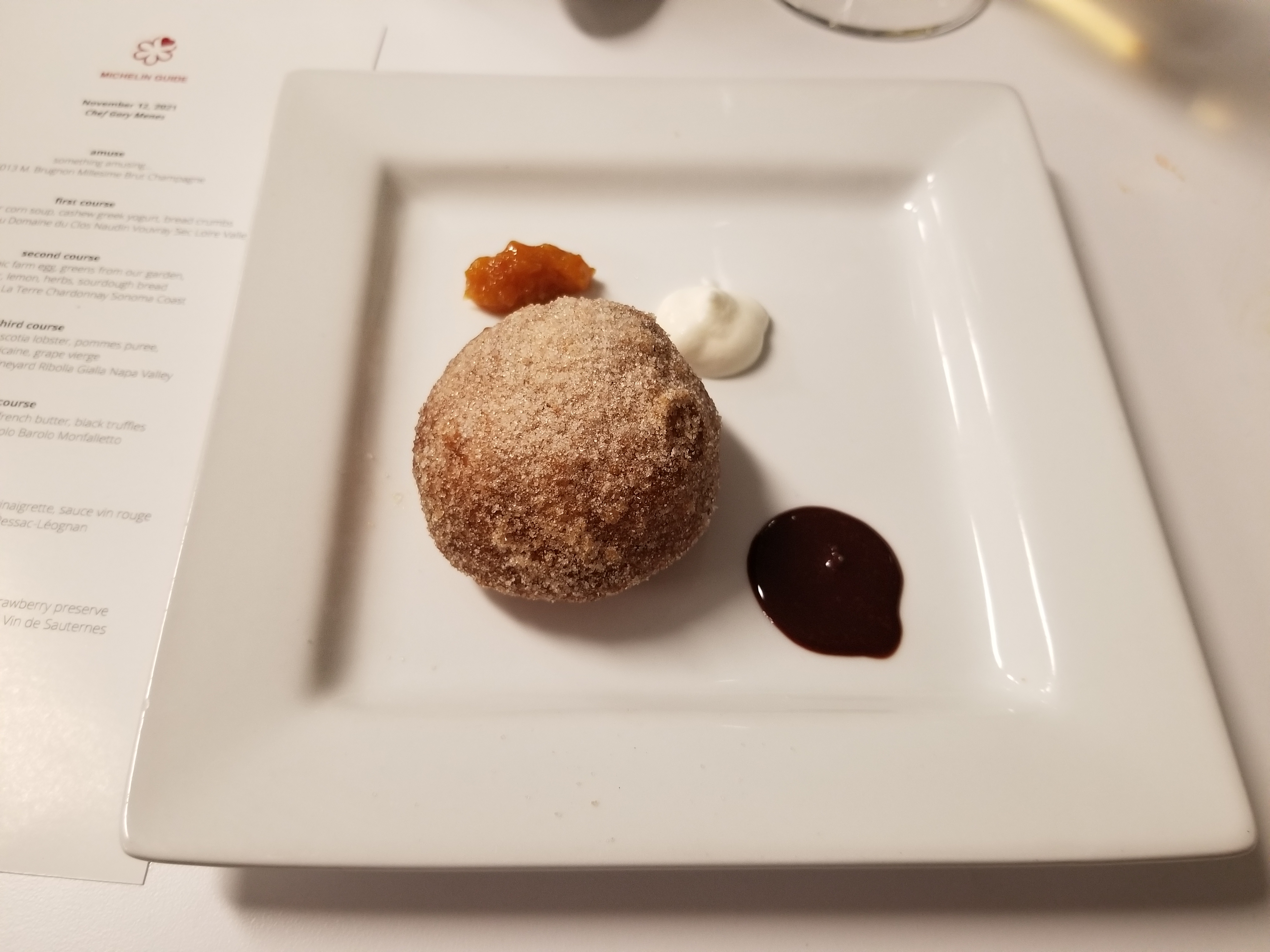 The sourdough donuts were very much like the sourdough bread for me; we only got one, and I wanted more. They were extremely delicious and dusted in cinnamon-sugar, and the three side sauces were also great. The wine here was definitely a dessert wine and could have been enjoyed all on its own; it was cloyingly sweet, but it didn't taste like cough syrup the way some dessert wines do. I really liked it, but again, that could have been because I'd had five other glasses of wine.