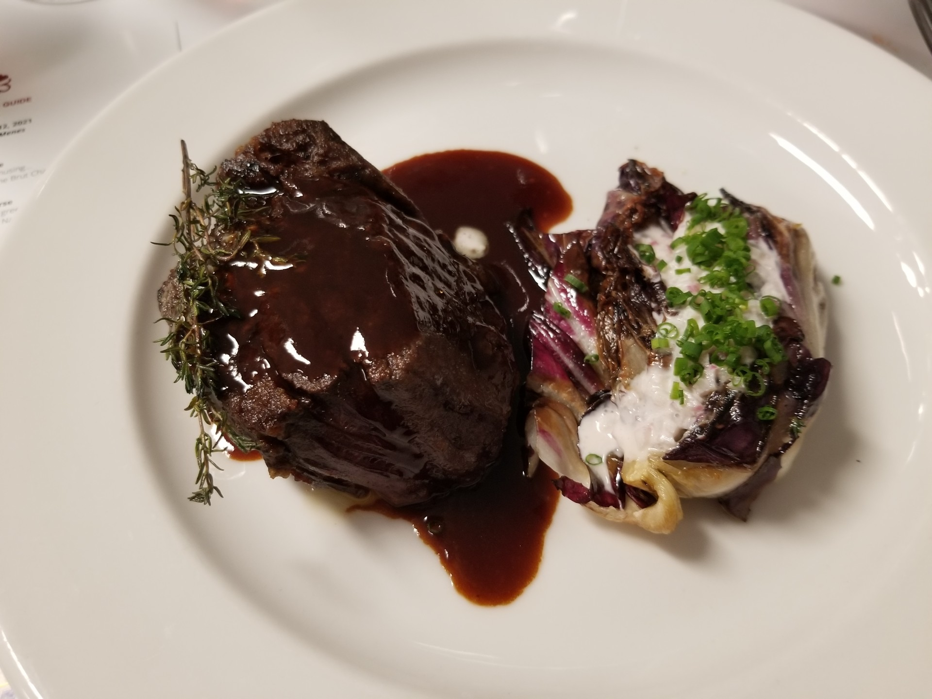 Grilled treviso, callote de boeuf, red wine vinaigrette, sauce vin rouge. Paired with a 2010 Chateau Smith Haut Lafitte Pessac-Léognan.