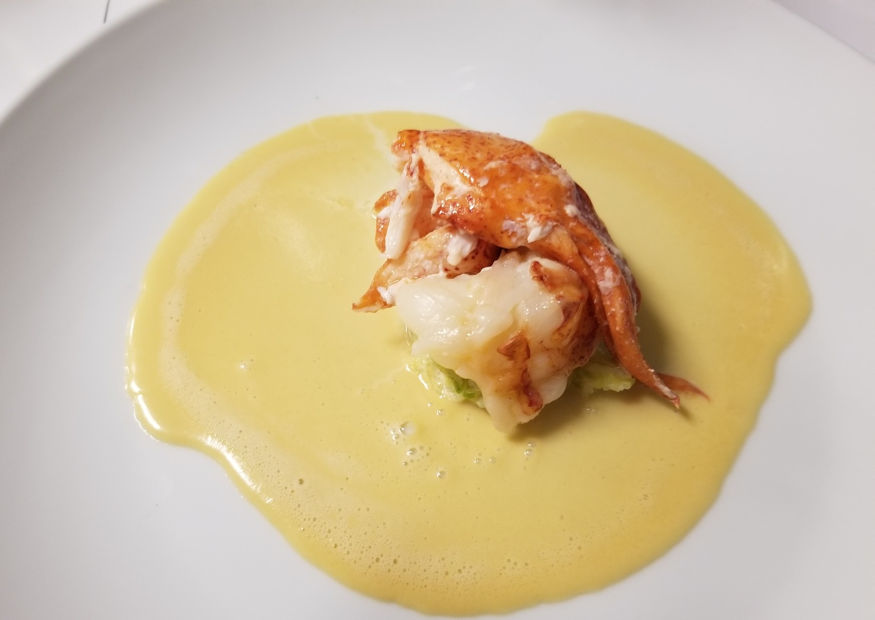 Butter poached Nova Scotia lobster, pommes puree, sauce Americaine, grape vierge. Paired with a 2018 Arnot-Roberts Vare Vinyard Ribolla Gialla Napa Valley.